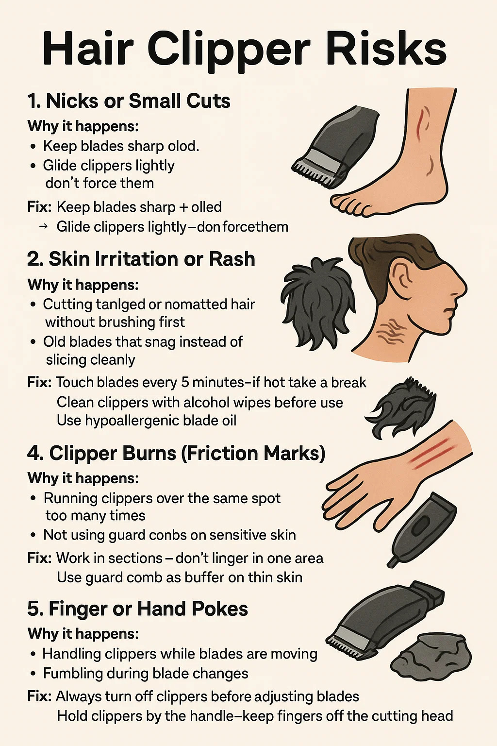 نعم باستخدام أ ماكينة قص الشعر يمكن أن يؤدي إلى إصابات طفيفة أو عدم الراحة إذا لم يتم التعامل معه بعناية. فيما يلي تفصيل مباشر للمخاطر الشائعة وكيفية تجنبها: