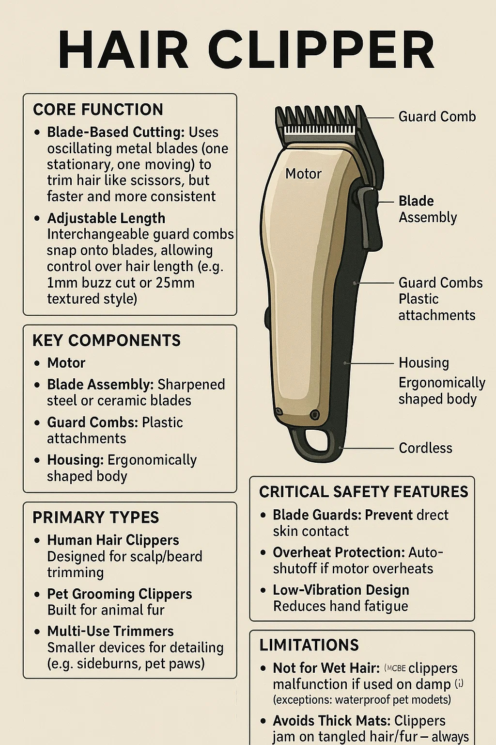 أ قصات الشعر هي أداة للاستمالة الكهربائية المصممة لقطع الشعر بكفاءة وموحدة. فيما يلي تفاصيل مفصلة لميزاتها الأساسية واستخداماتها: